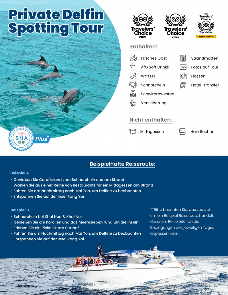 SAWAI Touren führt ein respektvolles Delfinbeobachtungsprogramm durch, das auf Ihre Bedürfnisse zugeschnitten werden kann. Sie bieten eine Kombination aus Delfinbeobachtungserlebnissen auf der Insel Mai Ton und einem Ausflug zur Koralleninsel oder zu den Khai-Inseln.