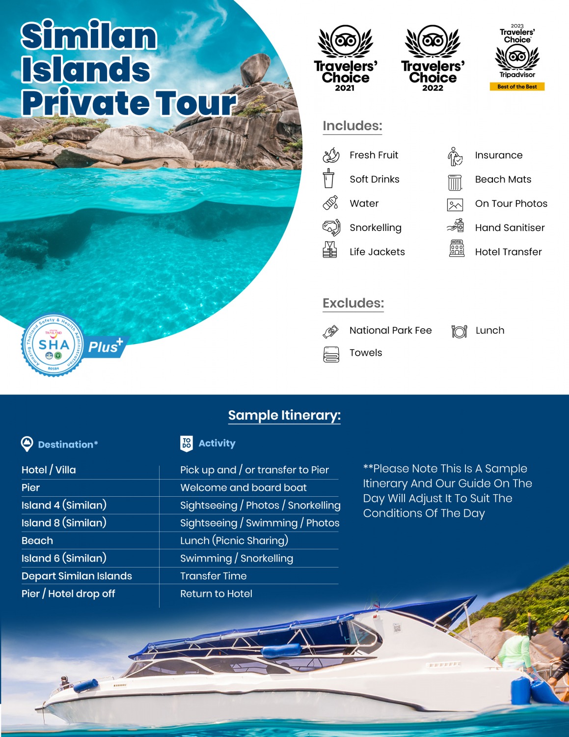 Enjoy a memorable boat trip to the renowned Similan Islands; a stunning archipelago in the Andaman Sea in southern Thailand, which is made up of 9 islands (please note that the Similan Islands are only open from October 15th to May 15th each year).