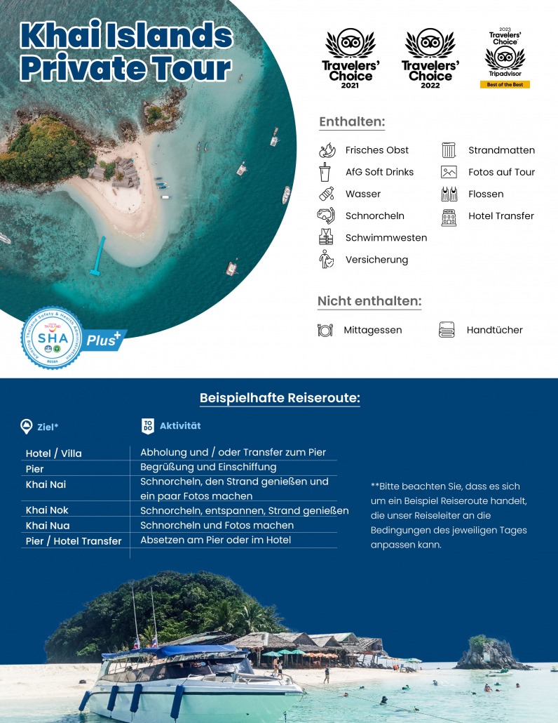 Erleben Sie einen perfekten Tag voller Entspannung und Unterwasserabenteuer auf unserer exklusiven Privattour zu den Khai-Inseln. Nur einen Katzensprung von Phuket entfernt, bieten diese drei malerischen Inseln ideale Bedingungen für Familien und Schnorchelanfänger.