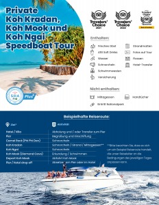 - Koh Kradan – Genießen Sie unberührte Strände und schnorcheln Sie an wunderschönen Korallenriffen direkt vor der Küste. Erleben Sie ein exklusives Strandpicknick in paradiesischer Umgebung.