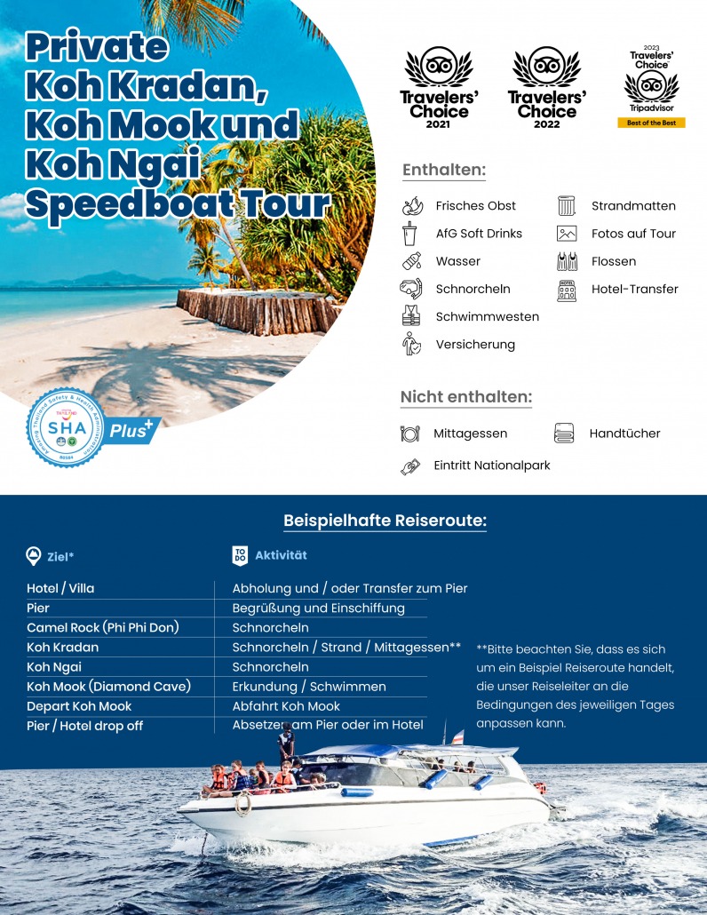 Erleben Sie die unvergleichliche Schönheit der weniger bekannten Inseln Koh Kradan, Koh Mook und Koh Ngai auf unserer maßgeschneiderten Privattour. Tauchen Sie ein in smaragdgrüne Lagunen, erkunden Sie geheimnisvolle Höhlen und entdecken Sie einige der schönsten Strände und Korallenriffe Thailands.