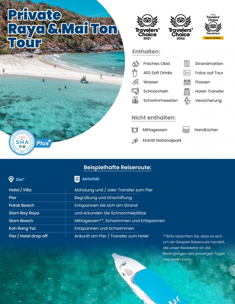 Entdecken Sie die unberührte Schönheit der Raya-Inseln und erleben Sie die Magie der Delfinbeobachtung bei Mai Ton auf dieser exklusiven Tagestour. Tauchen Sie ein in kristallklares Wasser, erkunden Sie farbenfrohe Korallenriffe und entspannen Sie an puderzuckerweißen Stränden.