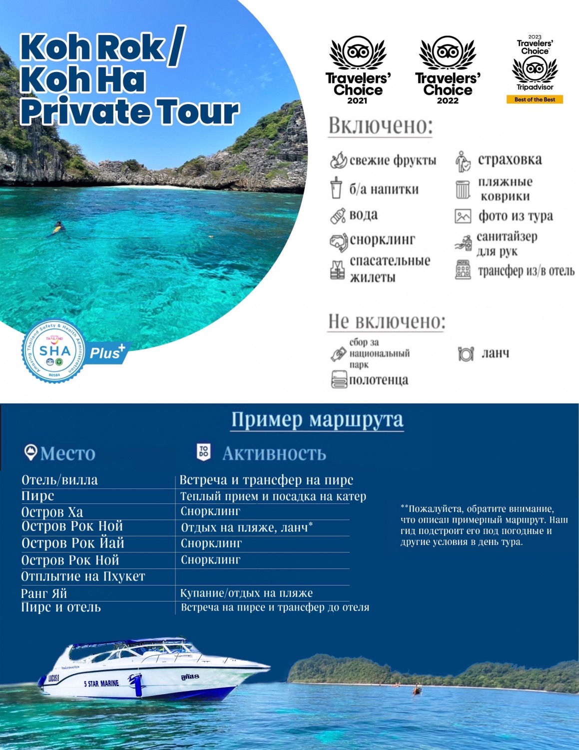 Выбрав частный VIP-тур на скоростном катере на Ко Рок и Ко Ха с SAWAI Tours, вы сможете открыть для себя самые потрясающие места для подводного плавания и пляжи на этих островах и вокруг них. Наши опытные гиды позаботятся о том, чтобы этот день по-настоящему запомнился.
