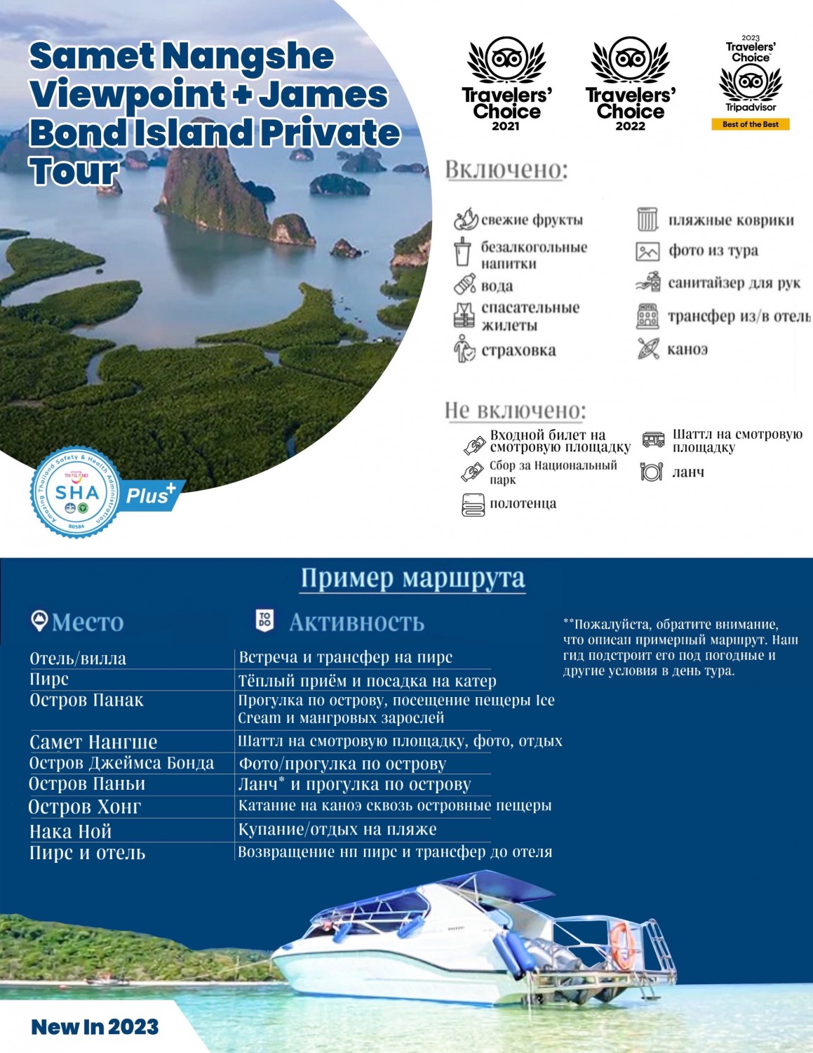 Тем, кто ищет незабываемого сказочного приключения, подойдет индивидуальный тур на смотровую площадку Самет Нангше и остров Джеймса Бонда. Этот опыт подарит вам целый день наслаждения видами знаменитых островов, плавучими ресторанами, прогулками и даже греблей на каноэ по пещерам.